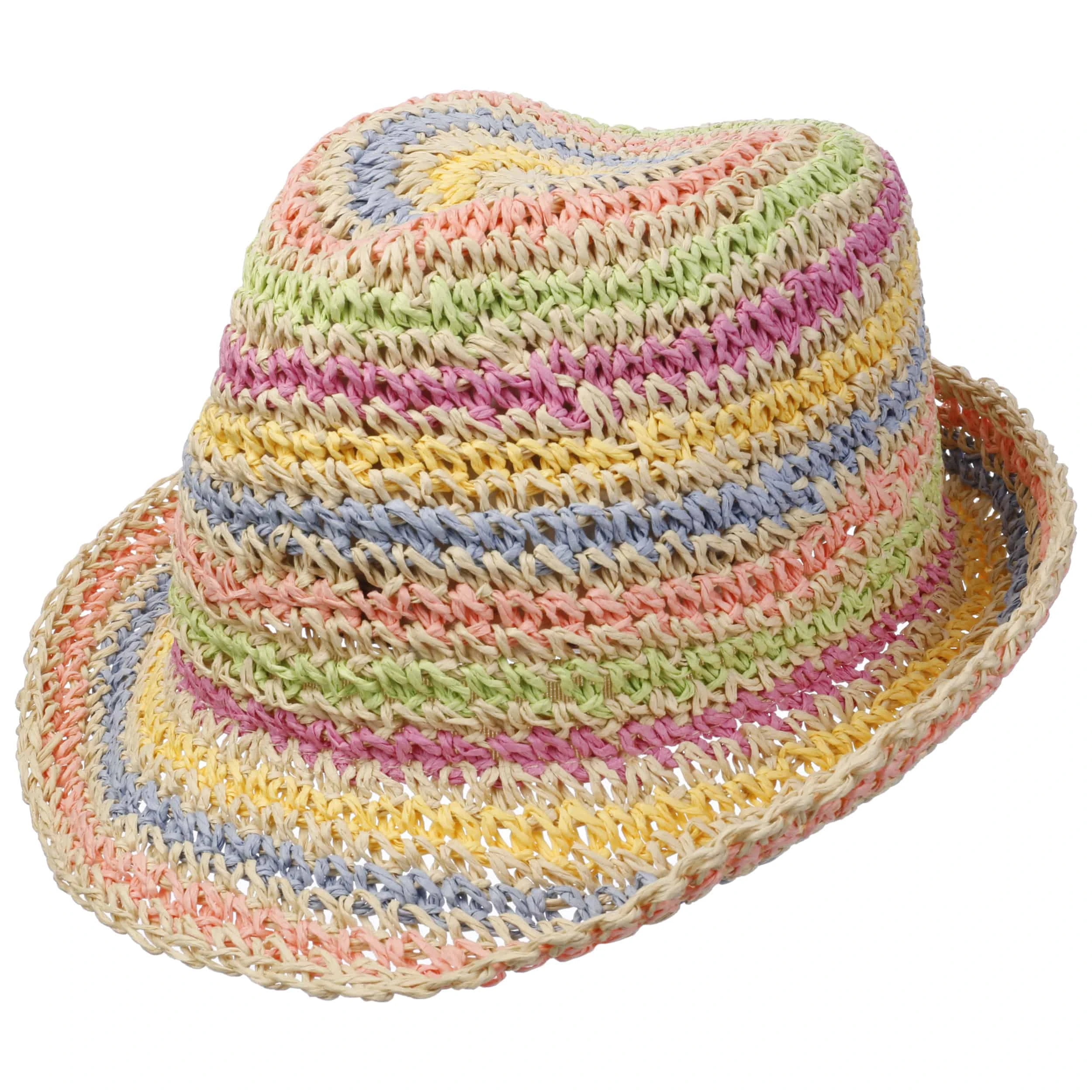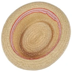 Aus Papierstroh gefertigt, verfügt der Trilby über eine luftige Struktur, mit der er bequem auf dem Kopf des Kindes sitzt und übermäßiges Schwitzen verhindern kann. Die circa 5,5 cm breite Krempe ist am Hinterkopf kess nach oben geschlagen. Vorne hält sie blendende Sonnenstrahlen vom Gesicht fern.