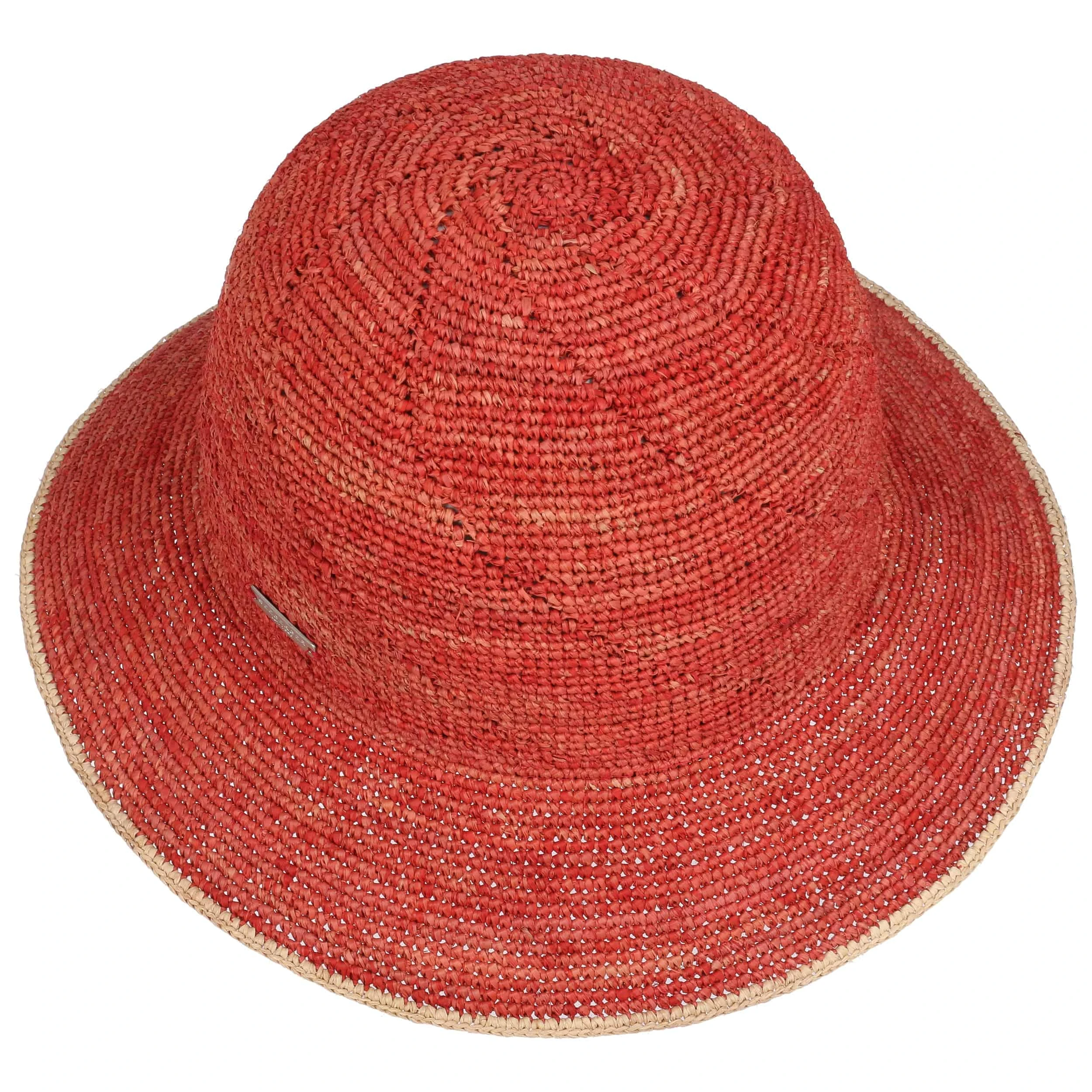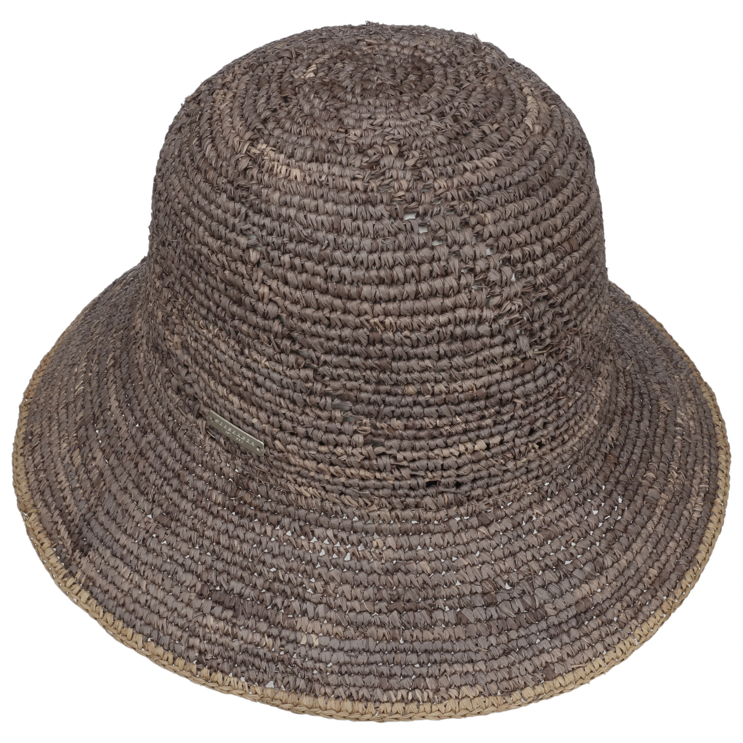 Mit seiner adretten Form, die von der breiten, nach unten geneigten Krempe und dem runden Kopfteil geprägt ist, versprüht der hochwertige Strohhut einen Esprit, der freundlich und anregend wirkt. Das sorgfältig geflochtene Material ermöglicht ein knitterfreies Rollen und Falten.
