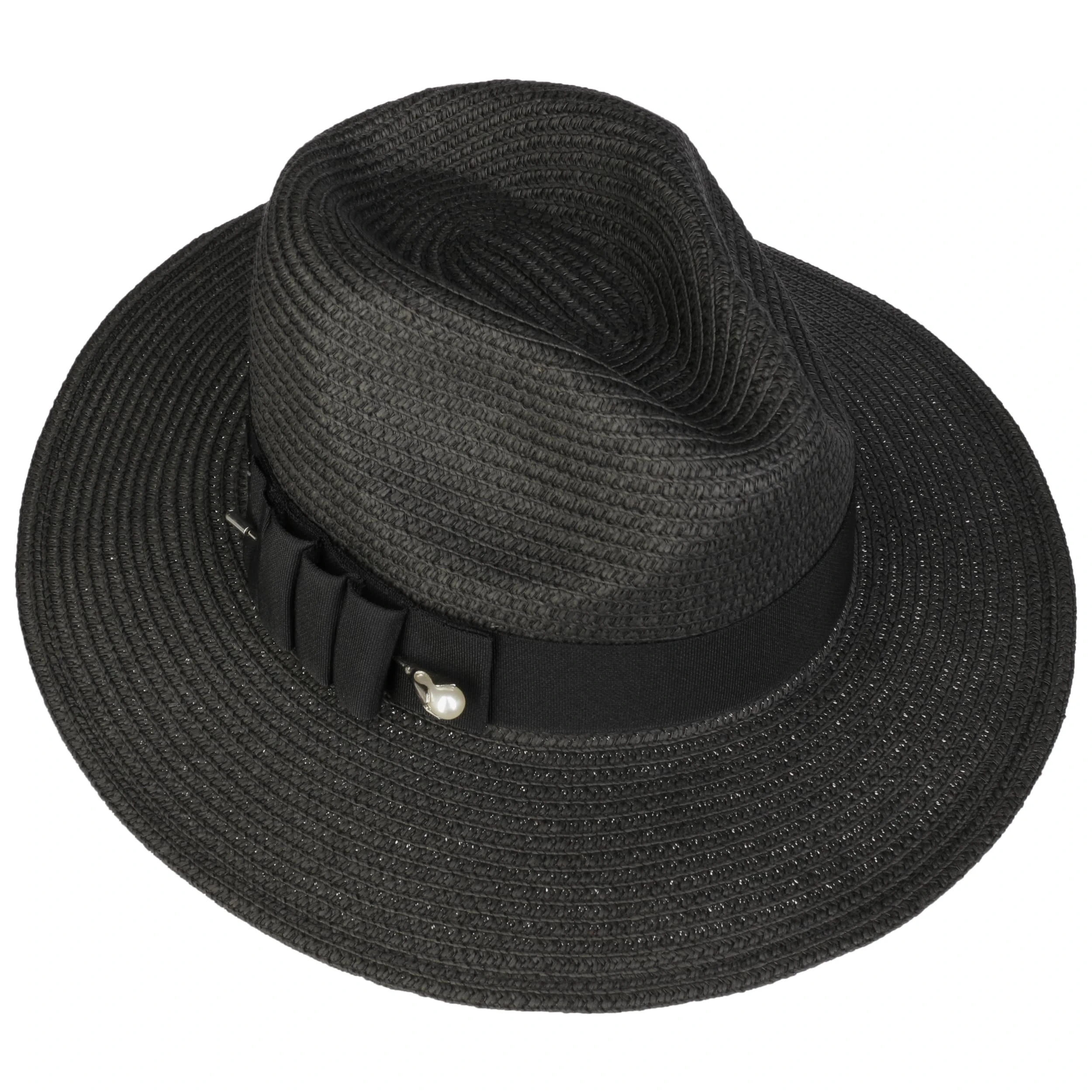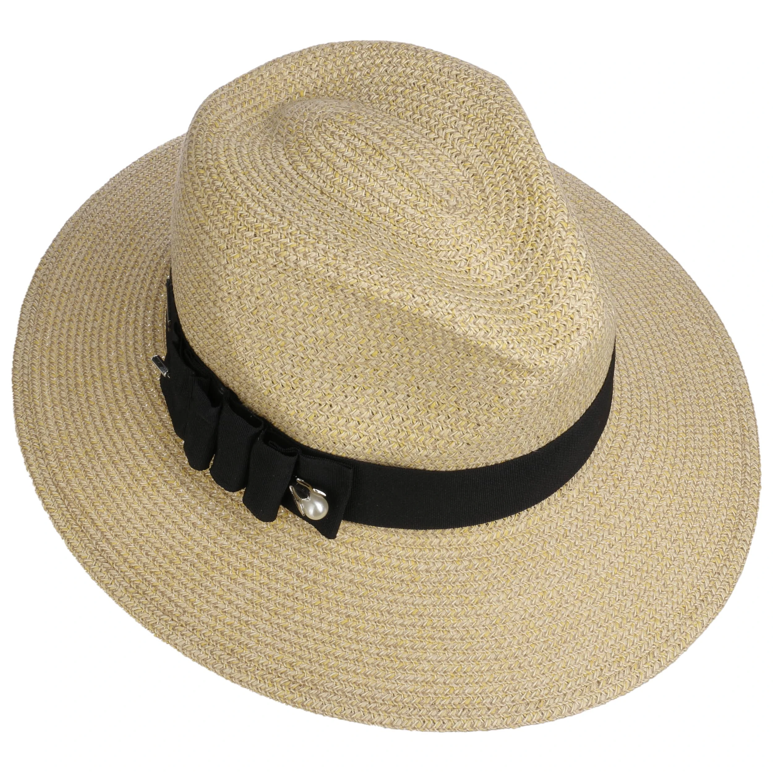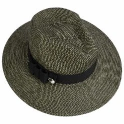 Die 8 cm breite Krempe schützt Gesicht und Nacken zuverlässig vor der Sonne. Für einen optimalen Halt und Tragekomfort sorgt ein Schweißband auf der Innenseite. Um die Krone ist ein breites Ripsband mit Anstecknadel und Kunstperle, Schleife und Betmar-Logo befestigt, das dem Stoffhut eine moderne Ästhetik verleiht.