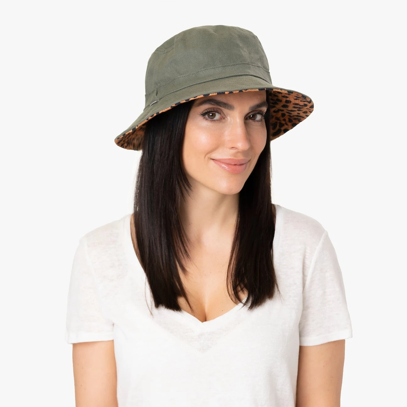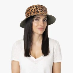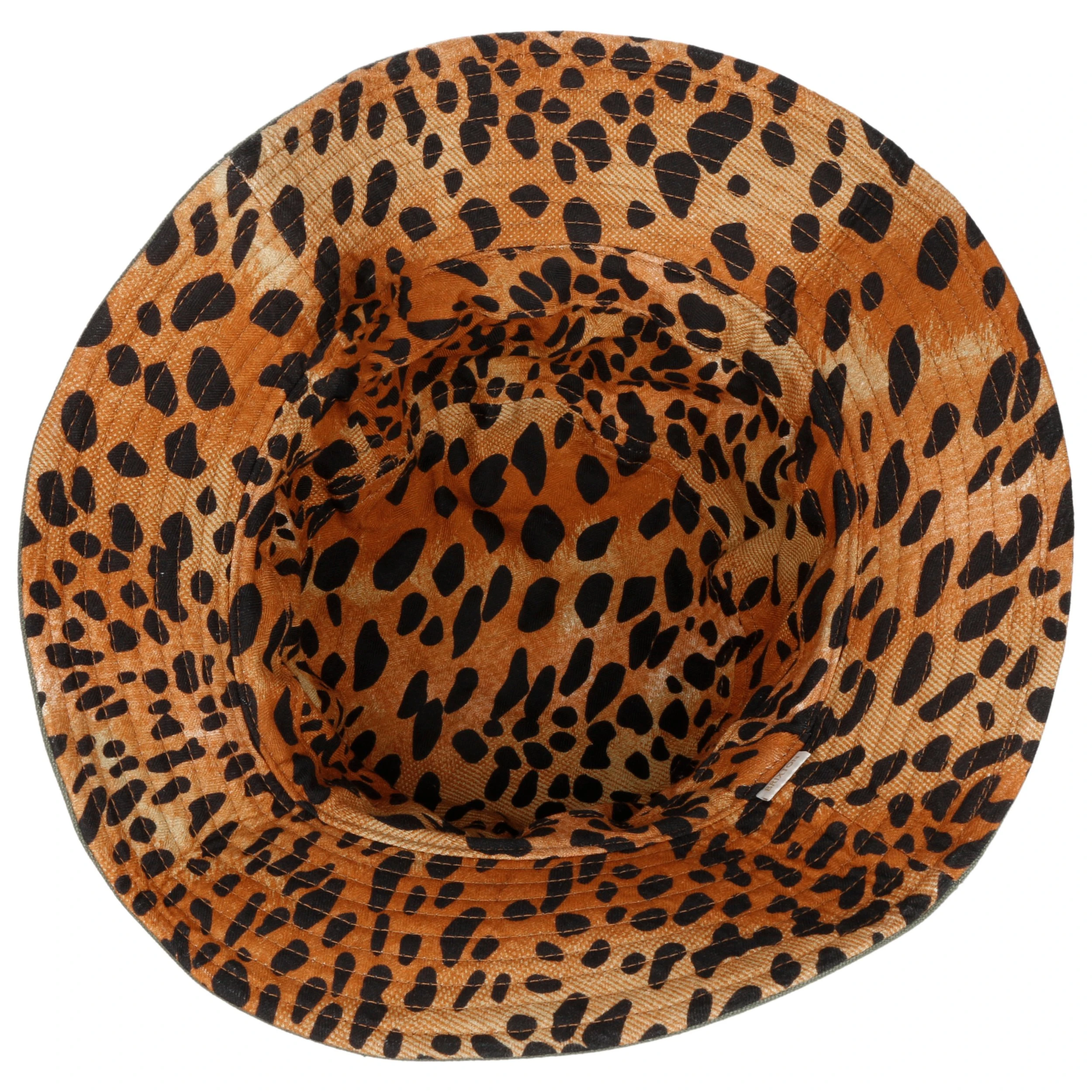 Um vom zurückhaltenden Monochrom-Stil zum auffälligen Leomuster zu wechseln, muss das Modell lediglich gewendet werden. Dank des pflegeleichten knitterfreien Materials lässt sich der Bucket Hat unkompliziert in der Tasche verstauen.