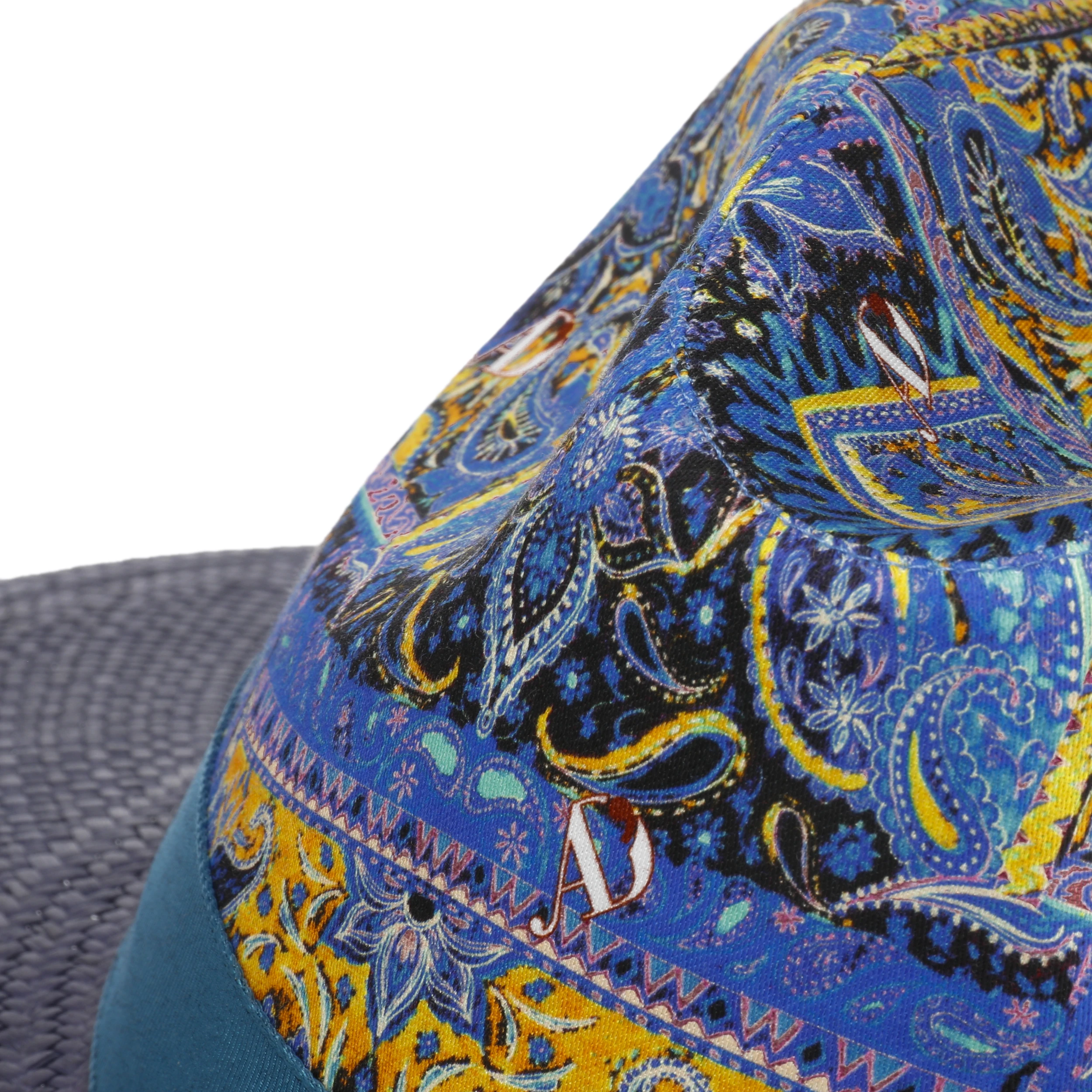 Die Krone des handgefertigten Sommerhuts strahlt mit einem prachtvoll gemusterten Leinenstoff pure Lebensfreude aus. Die breite Krempe aus unifarbenem Panamastroh wirkt als beruhigender Kontrast. Der Clou: das mehrfarbige Ripsband mit dem charakteristischen Logo. Für modebewusste Hutfans mit Sinn für das gewisse Etwas.