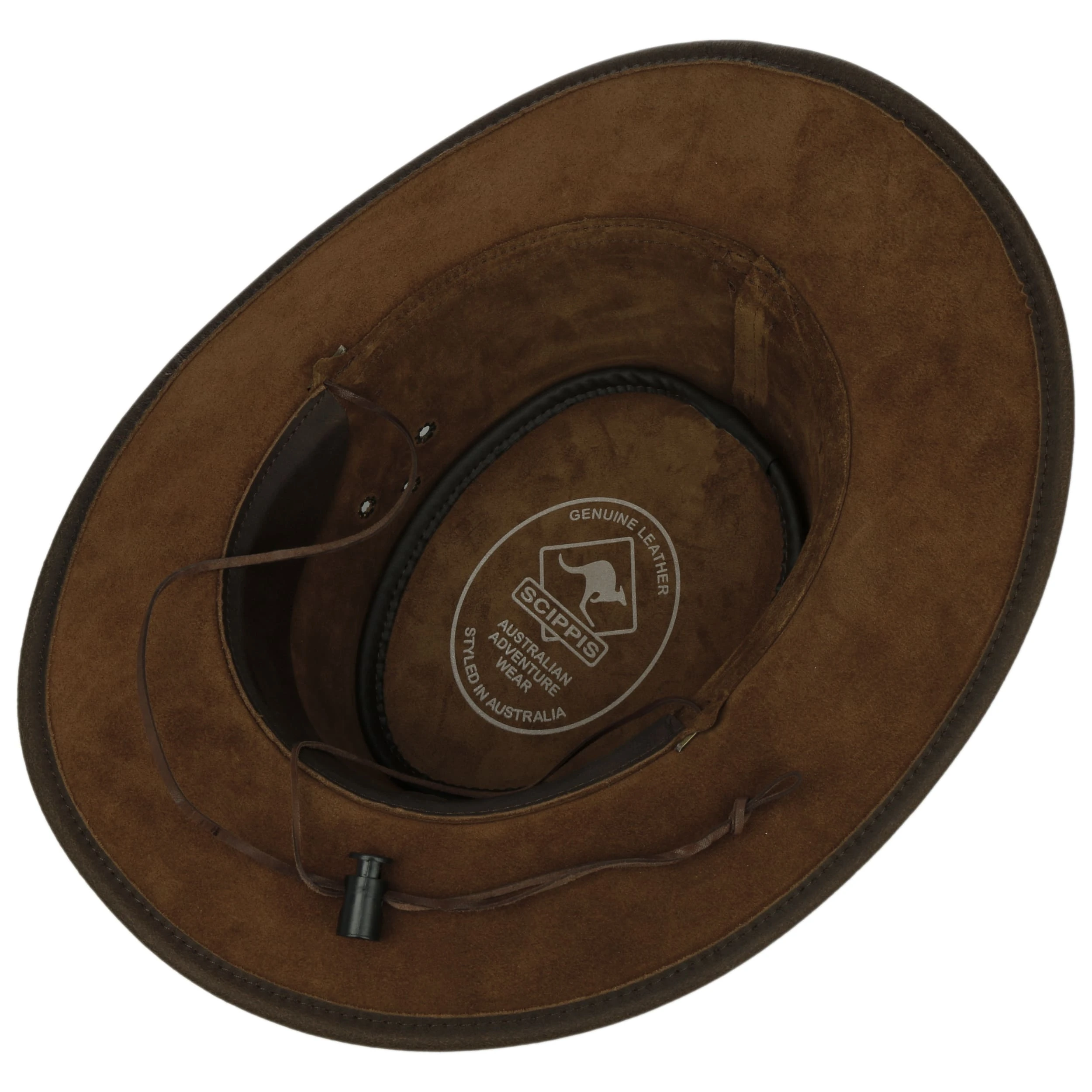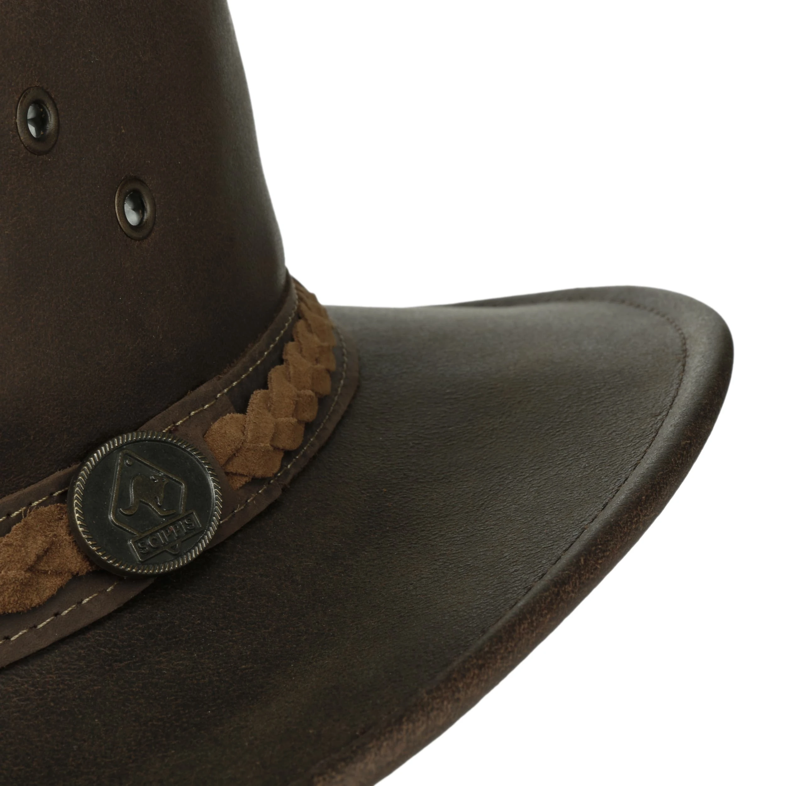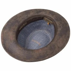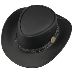 Die typische Form eines Westerns und das Material aus 100% Leder prägen den authentischen Charakter, der den Reiz der strapazierfähigen Kopfbedeckung ausmacht. Viele Details wie ein Kinnband, Belüftungsösen und ein teilweise geflochtenes Garniturband machen den Hut zum anregenden Blickfang.