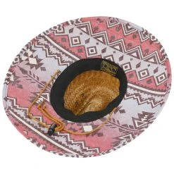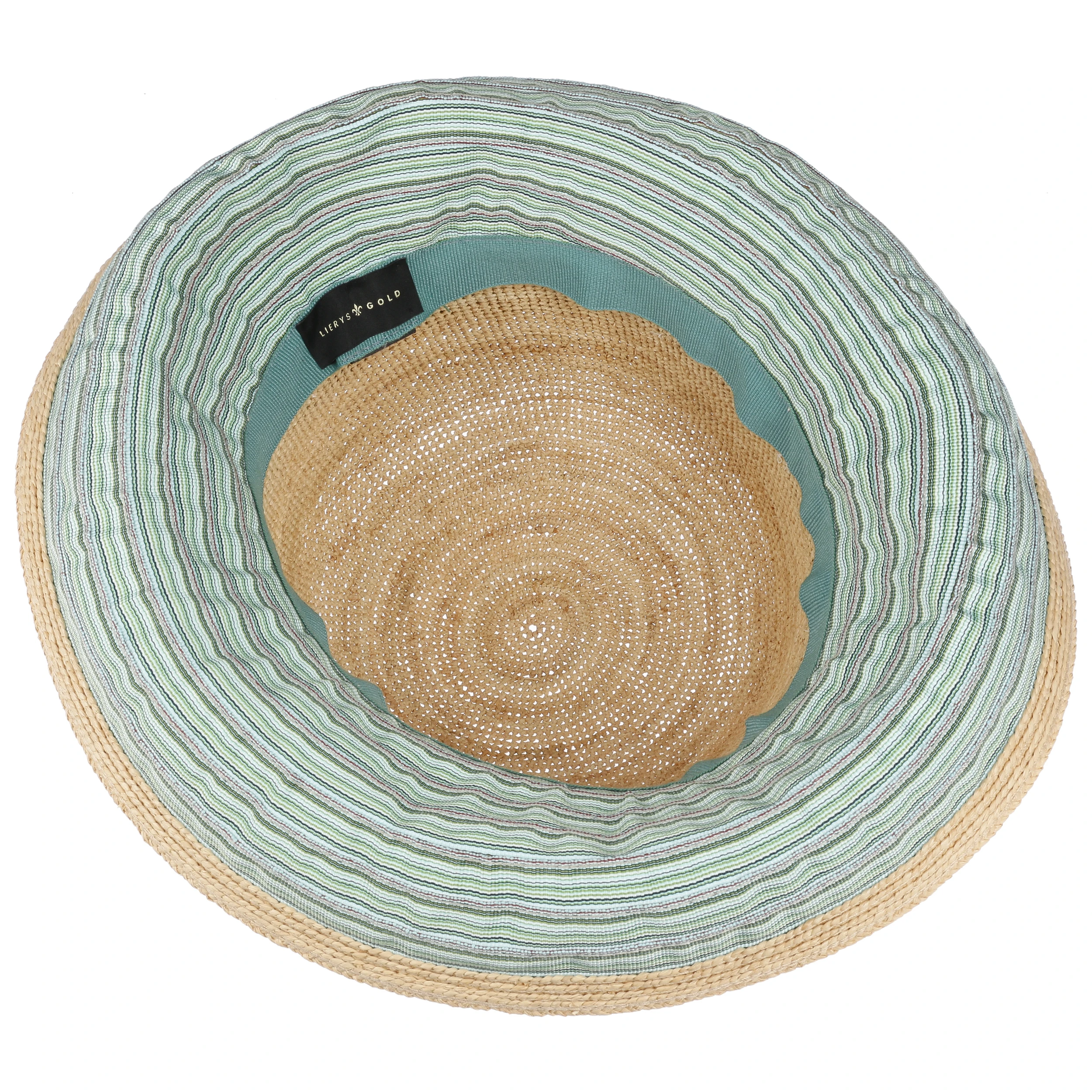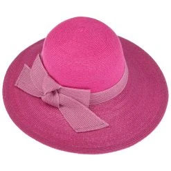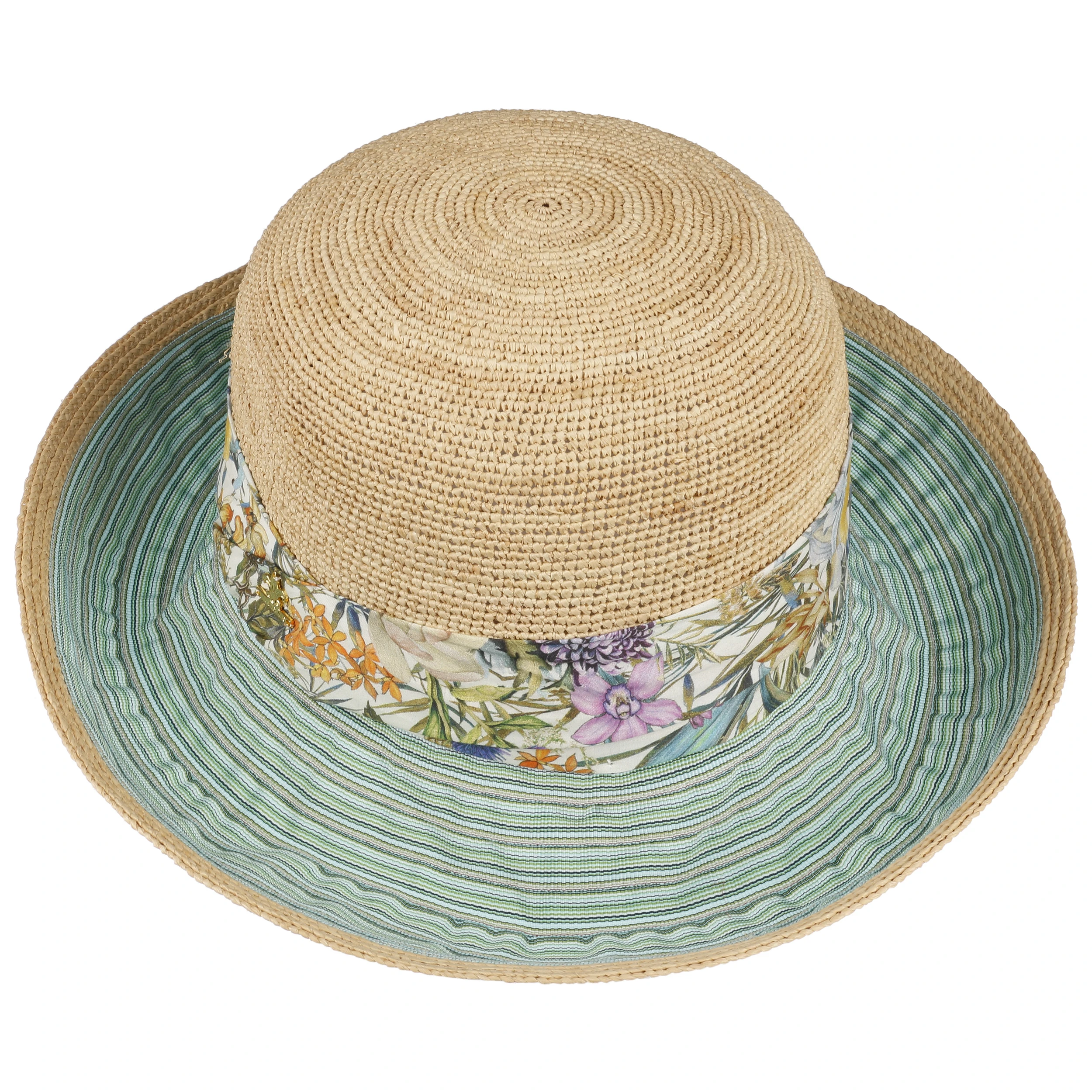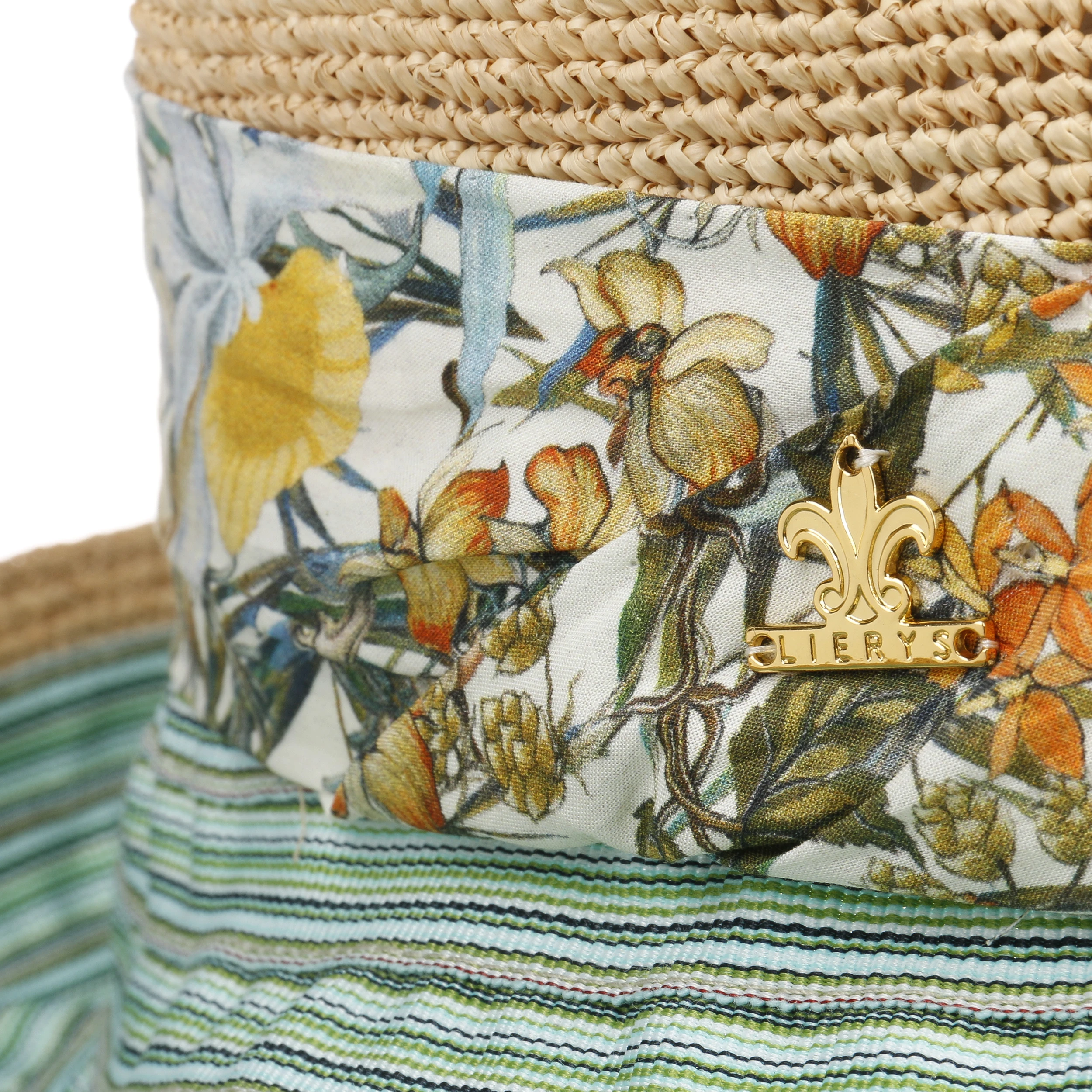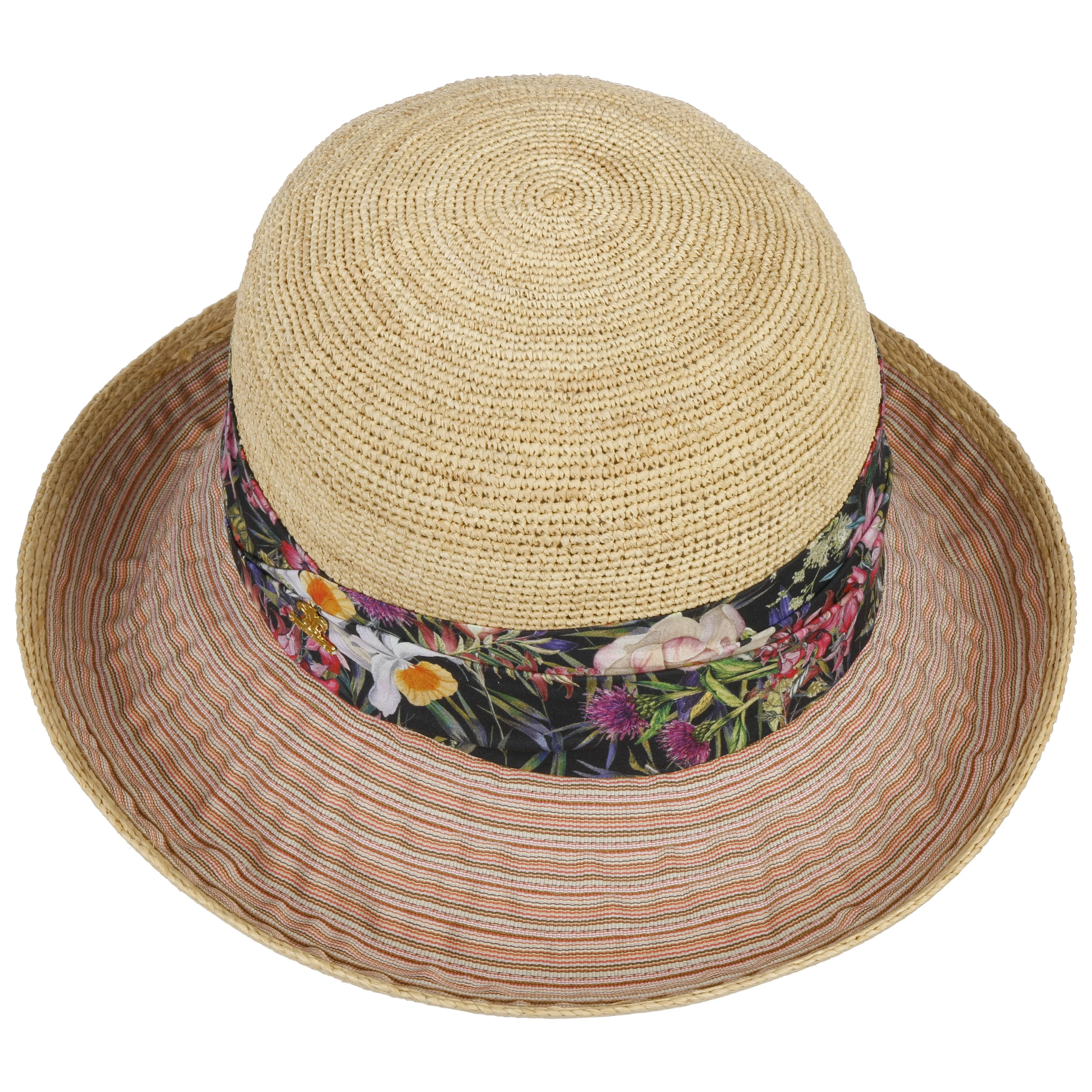 Während das breite Garniturband ein mehrfarbiges Muster aus unzähligen lieblichen Blüten präsentiert, zeigt die breite, an den Kanten nach oben geschwungene Krempe ein modernes Muster aus feinen Streifen. Das Design erinnert an einen Teich mit blühenden Seerosen – elegant und romantisch.